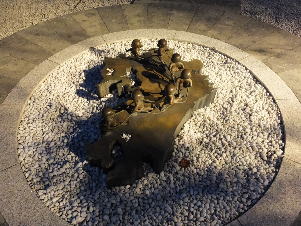 博多駅の駅ビルの屋上にある神社。鳥居が4カ所計6個もあります。何から何まで鉄道にこだわっているのでそれを探すのも面白いです。7人の子供が九州の地図の上で電車ごっこしているオブジェはとってもかわいいです。