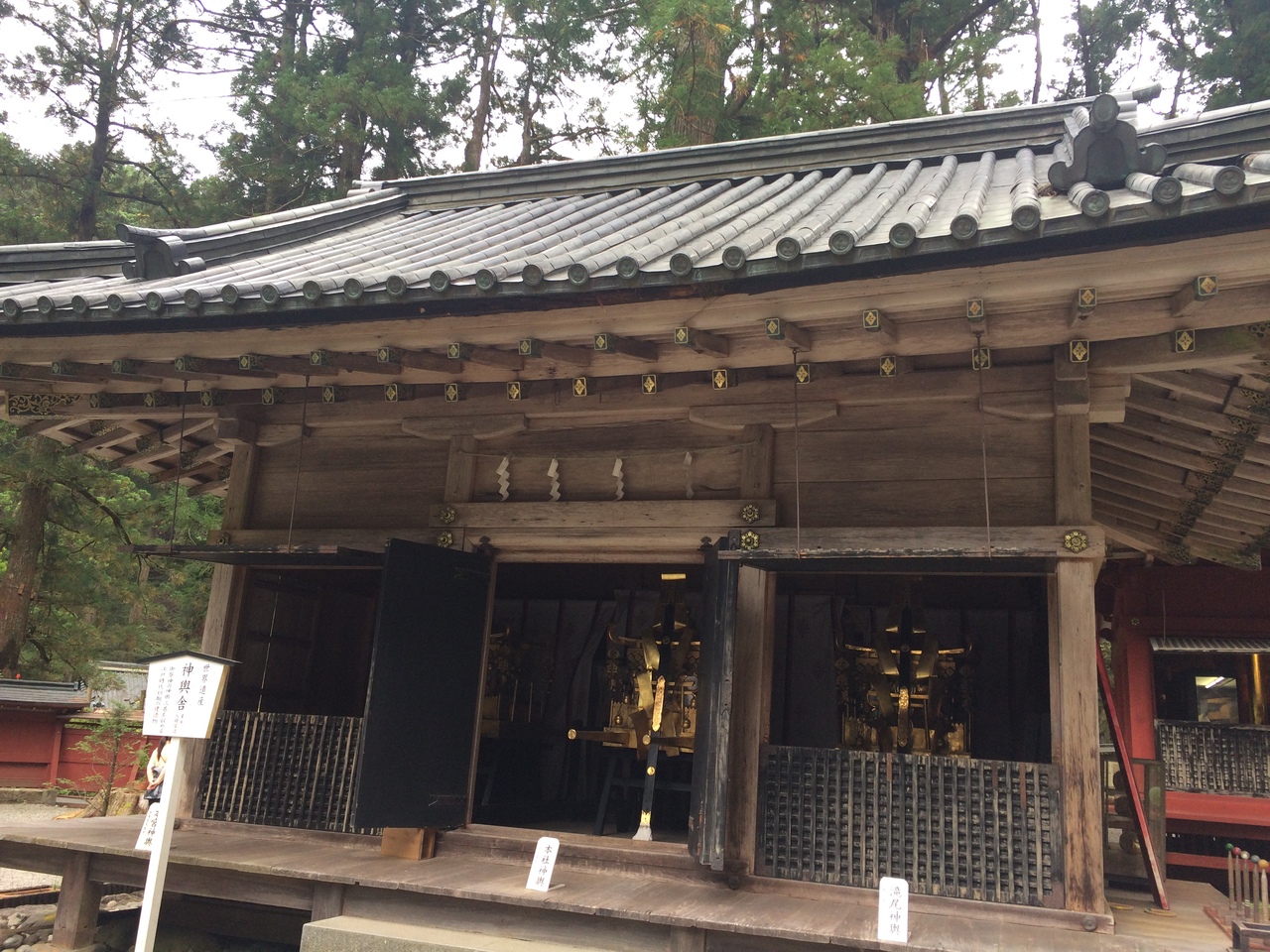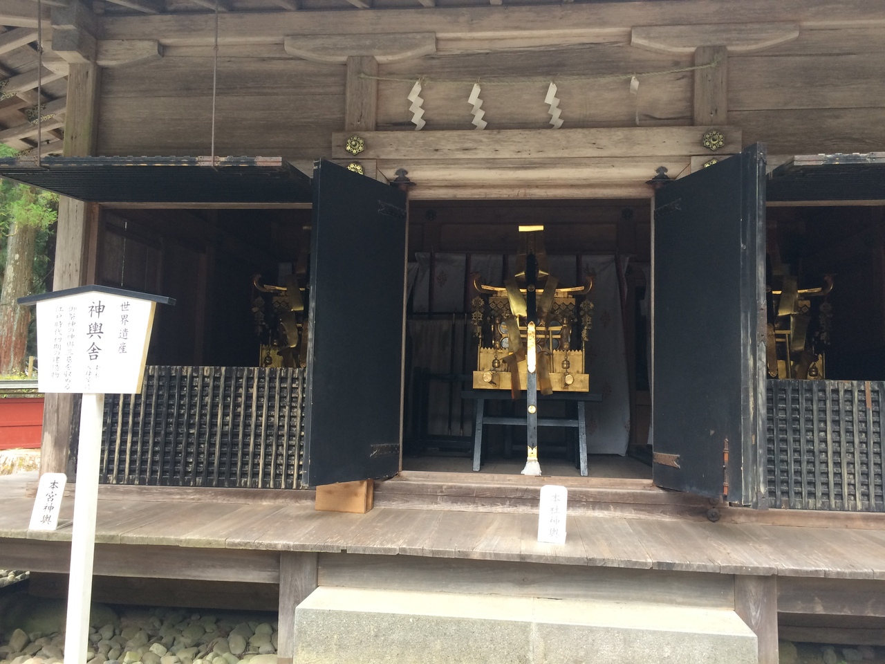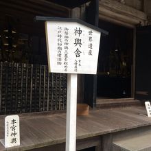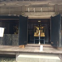 神苑の中の中央部にあり、神苑は200円で有料ですが見所が多いです。江戸時代初期の建物で入母屋造です。建物が古風があり、お堂のような感じが良いです。お堂は古いですが中の3つの神輿は金色で建物とは違う雰囲気でした。