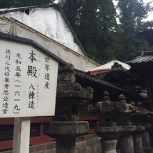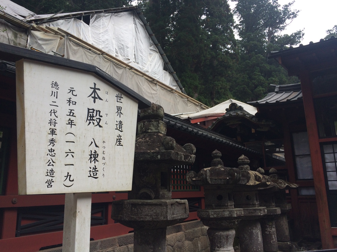 1619年、徳川秀忠公造営で八棟造の建物です。2016年10月訪問時は屋根の部分が白い幕で覆われ改修中でした。本殿 は渡殿で拝殿とつながっています。本殿は神職しか入ることが出来ず、外からの見学となります。日光三山の施設は豪華爛漫な建物が多いですが、この建物は少し色あせた感じが良かったです。