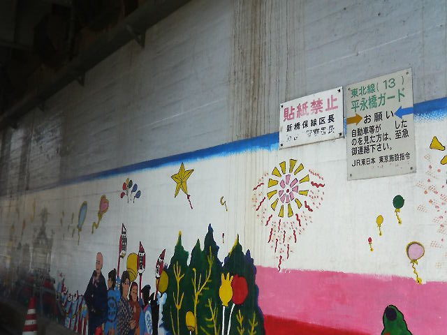 壁面に花火やお祭りなどの絵が描かれていて、無骨なガード下がちょっとだけ華やかな雰囲気になっていたのが印象的でした。