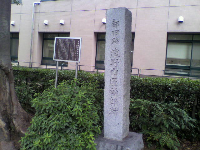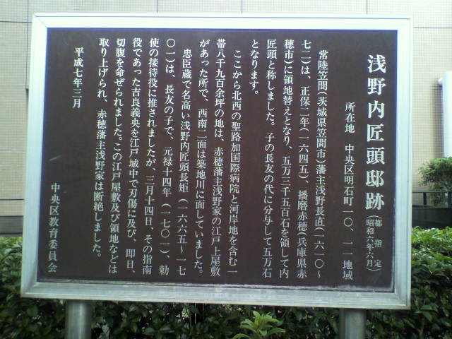 築地駅から月島方面に少し歩いたところに、浅野内匠頭邸跡の石碑がありました。東京都の旧跡なんだそうです。この場所から聖路加病院を含む一帯が、浅野家の江戸上屋敷だったとか。