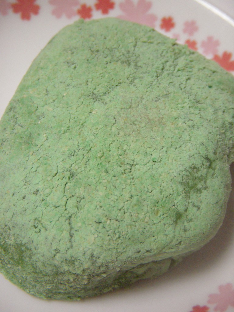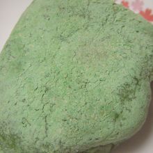 通常は、白餅に黄粉を塗すらしいが、当店のは蓬餅に薄緑色の粉を塗している。黄粉とは異なる、薬草っぽい香りが微かに感じられるお菓子に仕上がっている。その意味では、好き嫌いが分かれるかも。