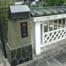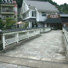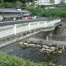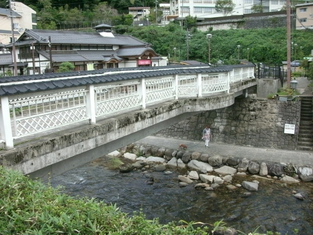 夢千代館の裏、春来川に架かる橋です。なまこ壁風のデザインの欄干の上に瓦を乗せたデザインの小さな橋で、夢千代館からこの橋を渡って”薬師湯”へ行くことができます。