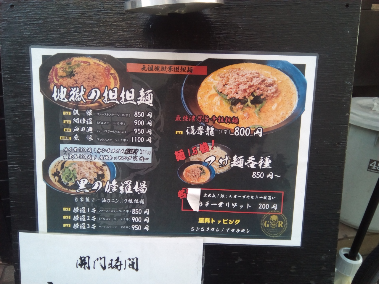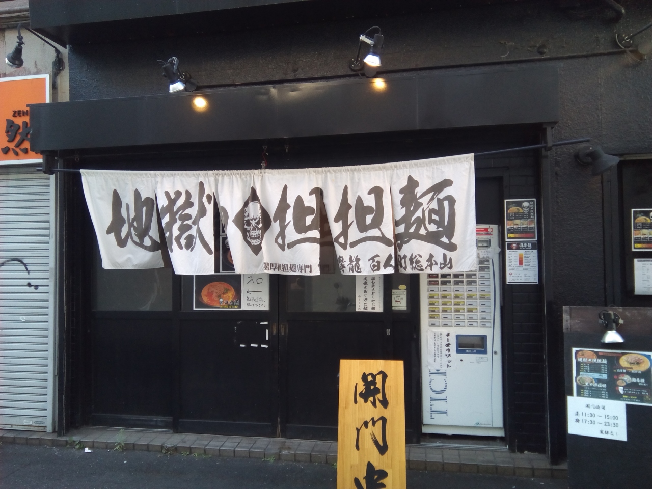 大久保駅南口改札を右に出て徒歩約1分。辛いものが大好きなので、暖簾の「地獄の坦々麺」でとても気になっていました。メニューは「護摩龍」「黒の修羅場」「無限」の大きく3種類に分類され、その中で辛さを選べます。