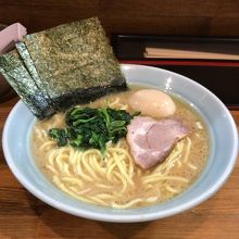 こってりめの豚骨スープに黄色くて太い麺で、海苔が香ばしいです。