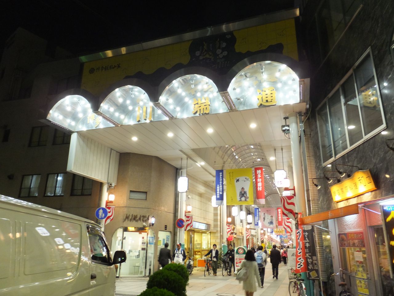 キャナルシティや天神のようなキラキラした商店街ではなく、高いアーケードの昔ながらの商店街です。自転車が通ったりします。まさに地元感。夜19時ころでも人通りは多く、明るい雰囲気で賑わってましたので安心して散歩ができました。