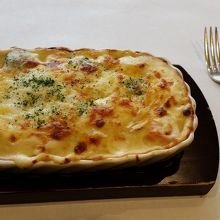 メニューはハンバーグ、ビーフシチュー等迷いに迷って「数量限定」ろいううたい文句に押されてエビのグラタンをオーダー。
