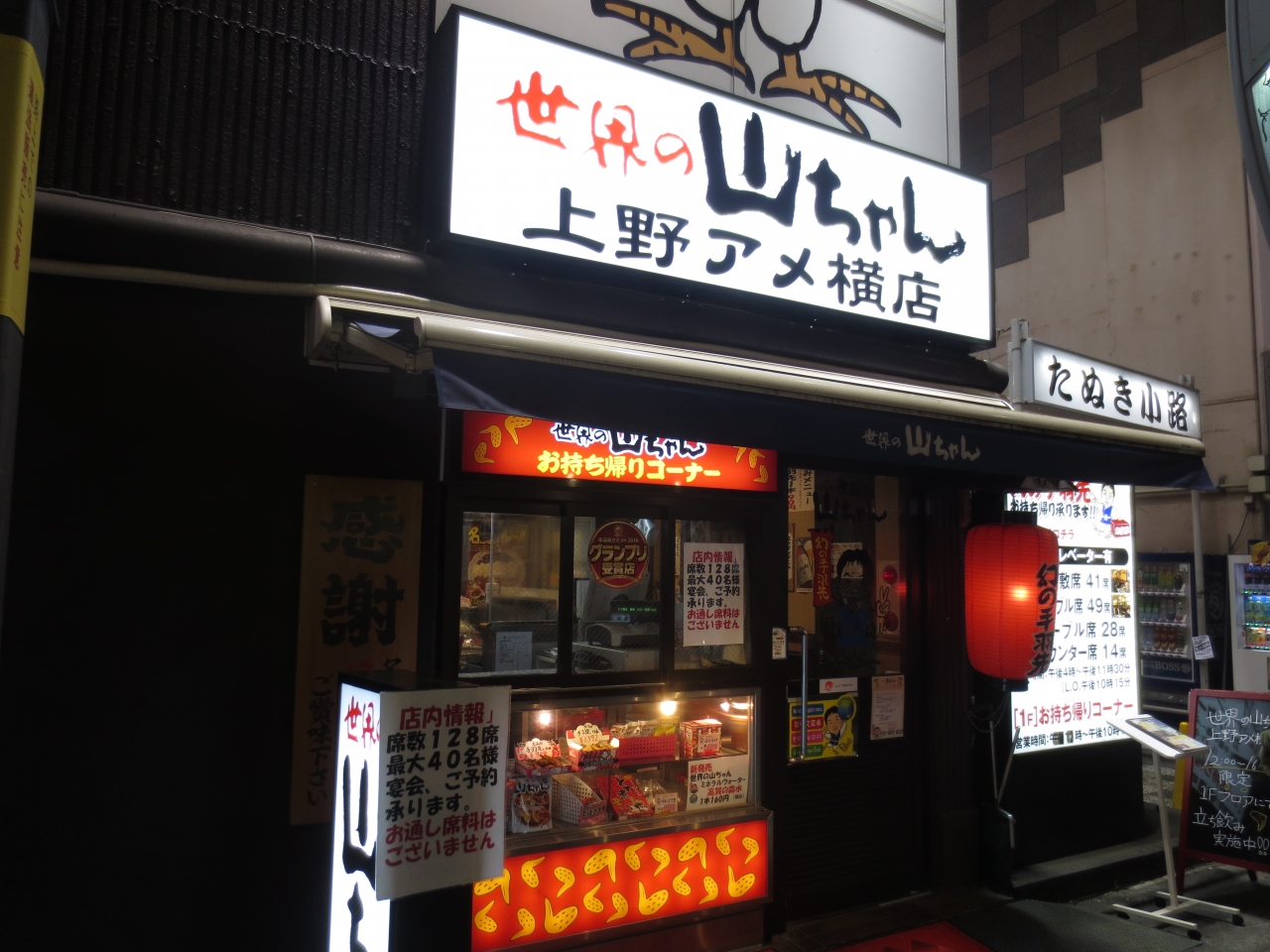 名古屋発祥の居酒屋、世界の山ちゃんです。こちらの店舗は御徒町からアメ横あたりの裏路地にあります。山ちゃんといえば、やはり「幻の手羽先」です。店内で食べることもしばしばですが、この手羽先、テイクアウトすることも出来ます。お土産に買ってかえれば喜ばれますし、ビールのおつまみとしても最適です。この味、永遠に不滅です。