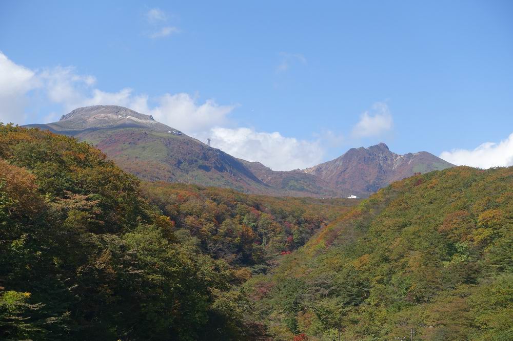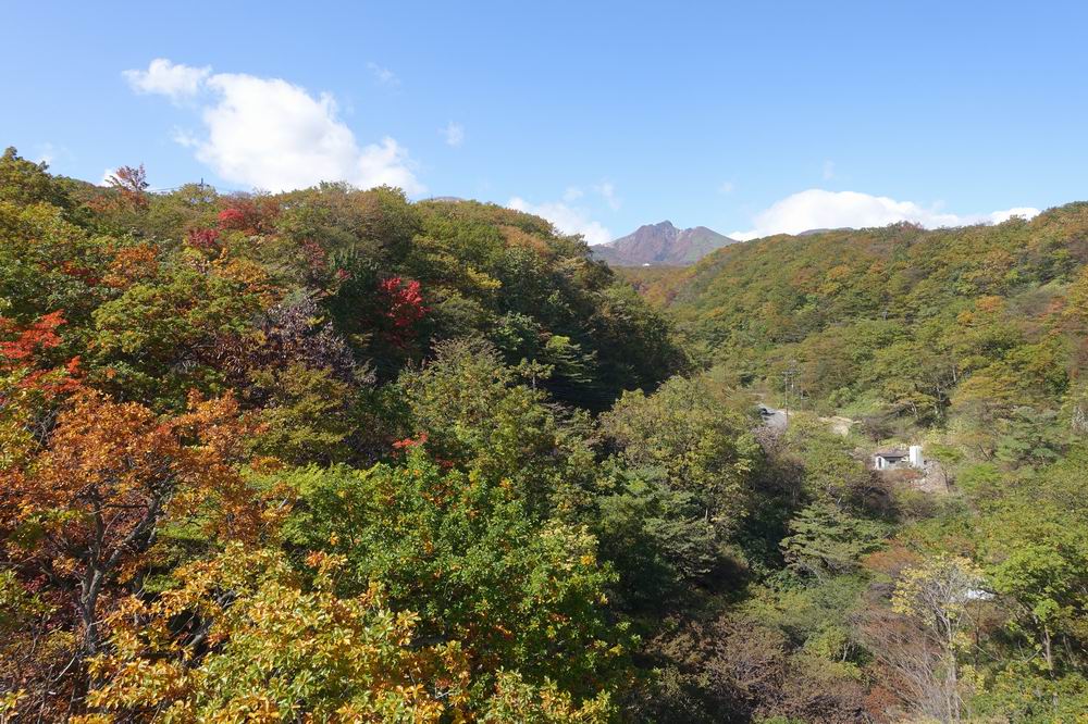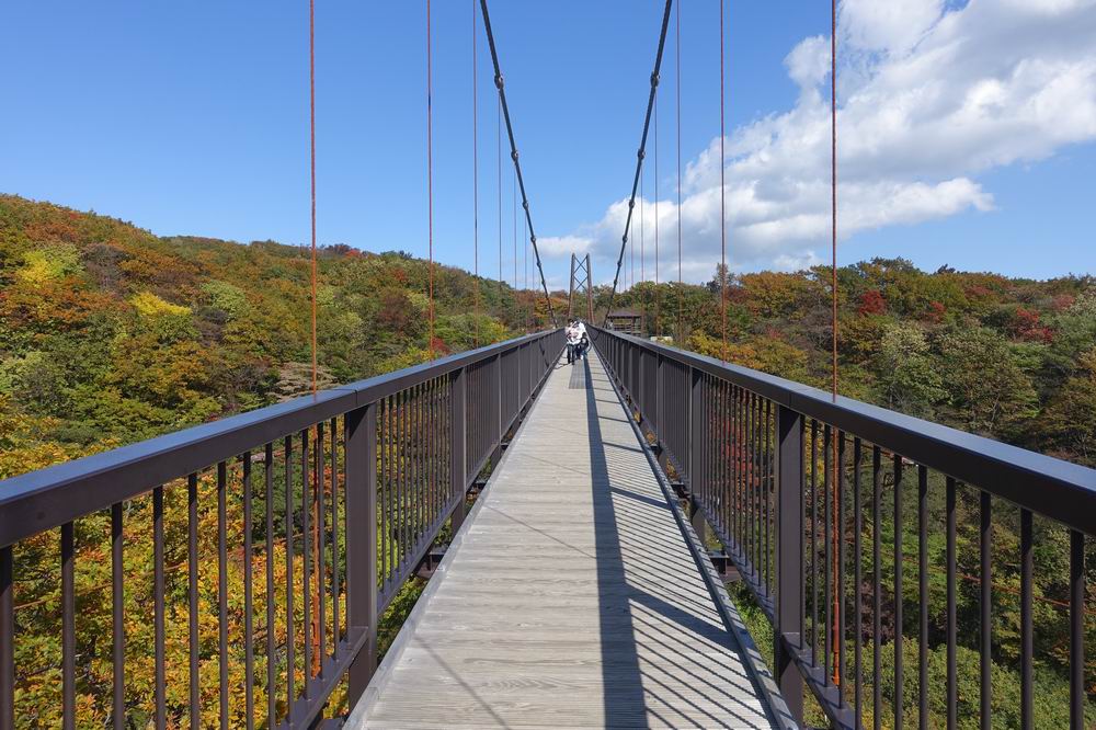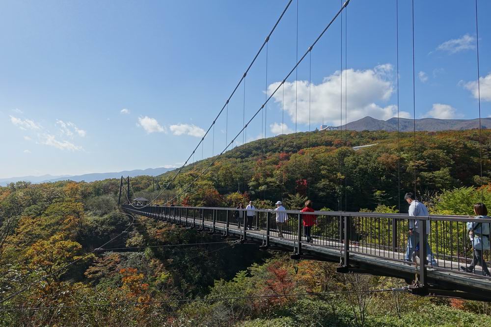 吊橋上からは那須連山の茶臼岳や朝日岳が望め、眺望もなかなかです。紅葉も色づいてきていました。吊橋を渡った先は自然の家やつつじ群落方面へと木道が続いていますが、マイカーで来た人は再び吊橋を渡って駐車場へ戻る形になります。