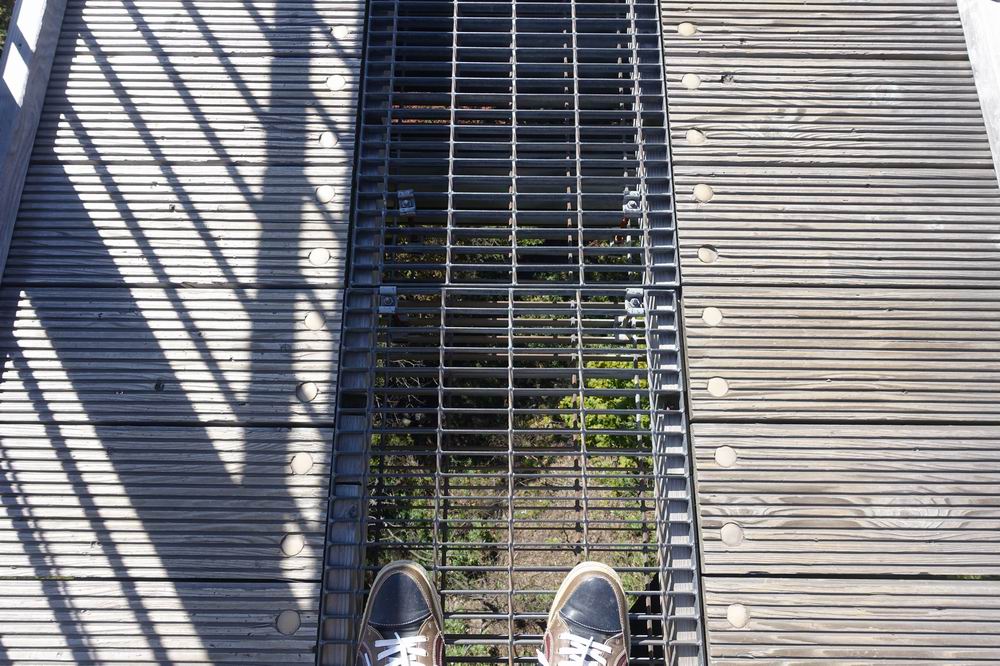 鹿の湯、殺生石から1キロほど山道を上ると、道路上に「つつじ吊橋駐車場」の案内板が見えてきます。駐車場から木道を数分歩くと吊橋に到着です。頑丈な造りで一見あまり揺れなそうに見えたのですが、この日はやや風があり、人出もガラガラってわけではなかったので結構揺れましたね。