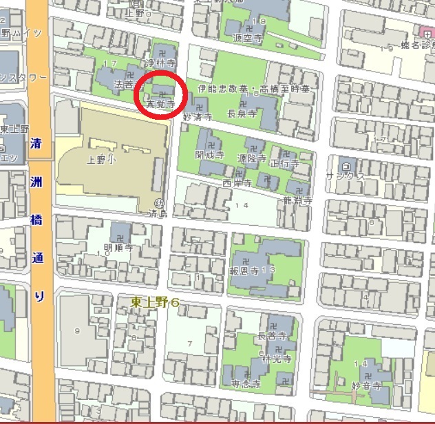 真覚寺は、本願寺の弟子が神田に創設したお寺で、明和の大火の後、東上野稲荷町に移転しました。