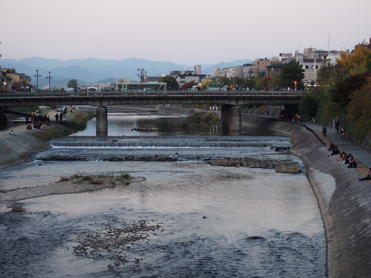 四条大橋は鴨川にかかる橋です。四条大橋は四条河原町と祇園、八坂神社などへと結ぶ橋なので交通量はとても多いです。歩道にもいつも大勢の人が歩いています。建仁寺から四条へと行くために、四条大橋のすぐ南に架かる六軒橋を渡りました。ここからは四条大橋の全体像がよく見られました。