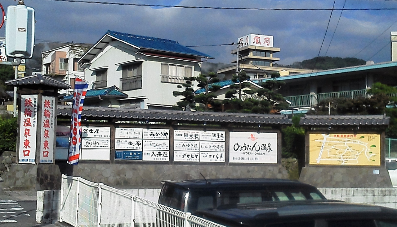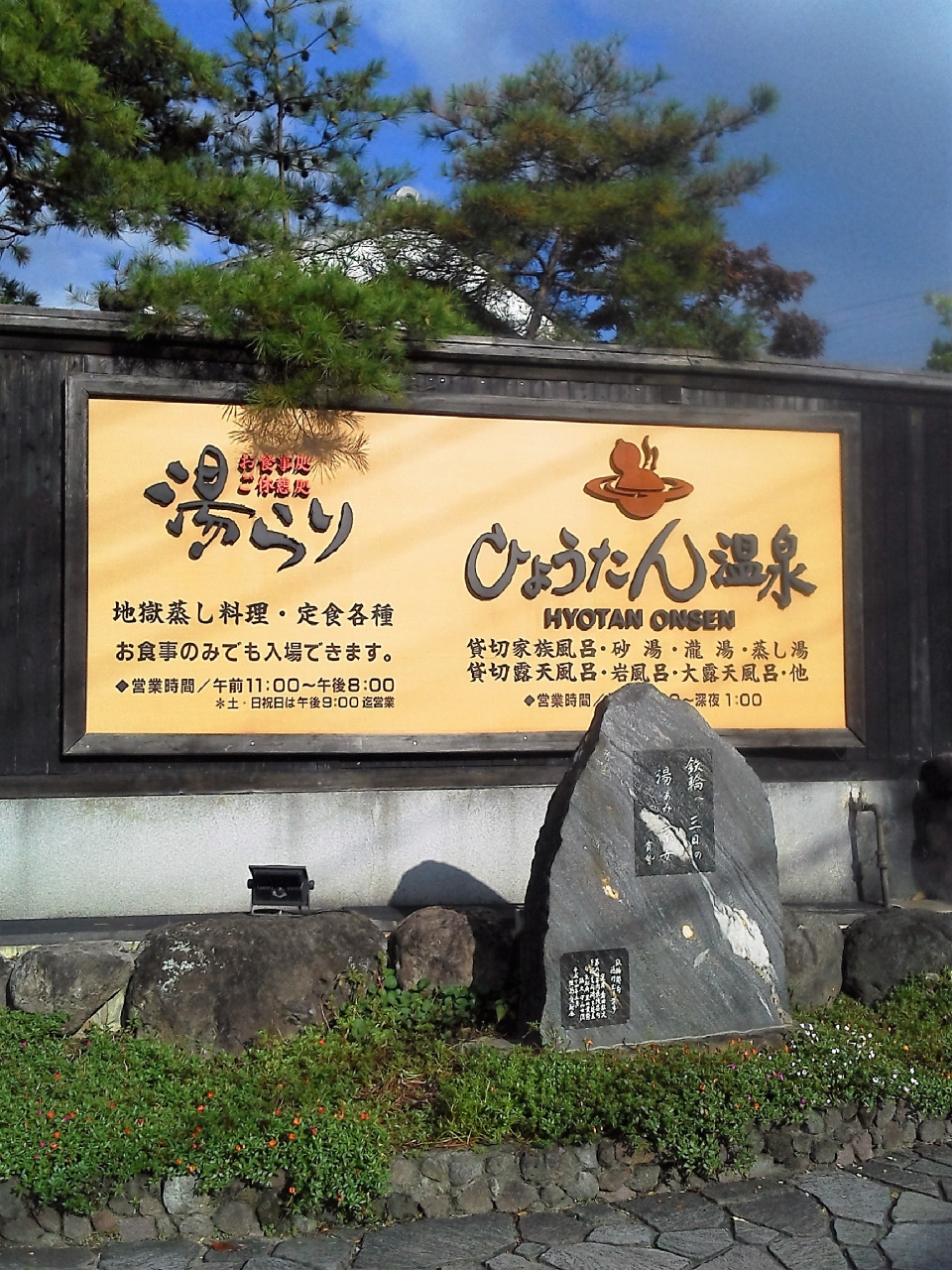 「ひょうたん湯」に行きました。別府駅の東口で鉄輪温泉行`地獄原`のバスが行ったままなので、立命館アジア太平洋大学 APU行き`砂原`に乗りました。`砂原`で降りたら直ぐに看板が目に留まりました。で、道なりに歩いたら3分で着きました(帰りはフロントでバス時刻表を見て`地獄原`で2分半) 。
