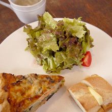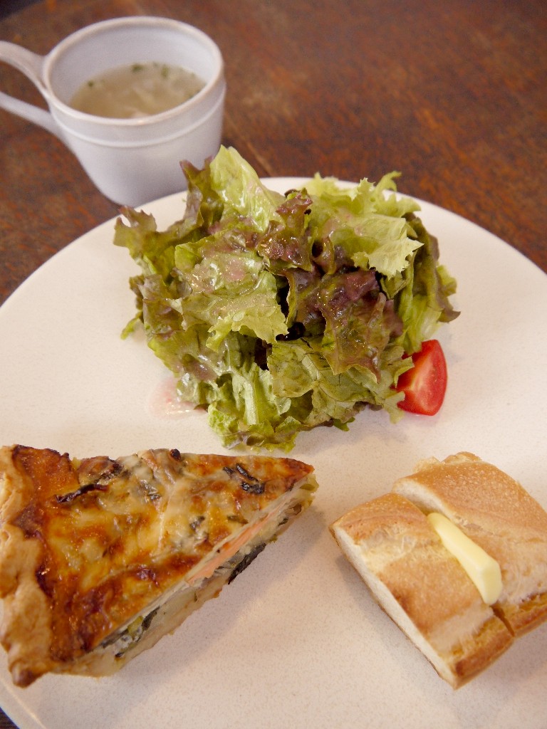 メインとなる皿に、キッシュ(日替わりらしい)、パン(自家製らしい)、サラダが盛られている。スープも別に提供される。これだけでは800円だが、150円追加で、ドリンクとミニデザートが付くとなったので、そうした。