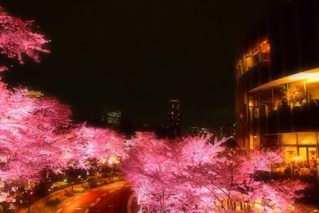 ミッドタウンガーデンがさくら通り沿いにずらっとライトアップされて華やかになります。なかでも自分のいちばんのお気に入りは、緩く右にカーブして下るさくら通りを歩道橋の上から眺めるポイント。右手に建つガラス張りのガーデンテラスが張り出して、サクラと見事な競演を見せてくれます。大勢の見物客が歩道橋の上で記念撮影しますが、なにぶん狭いところですのでご留意ください。