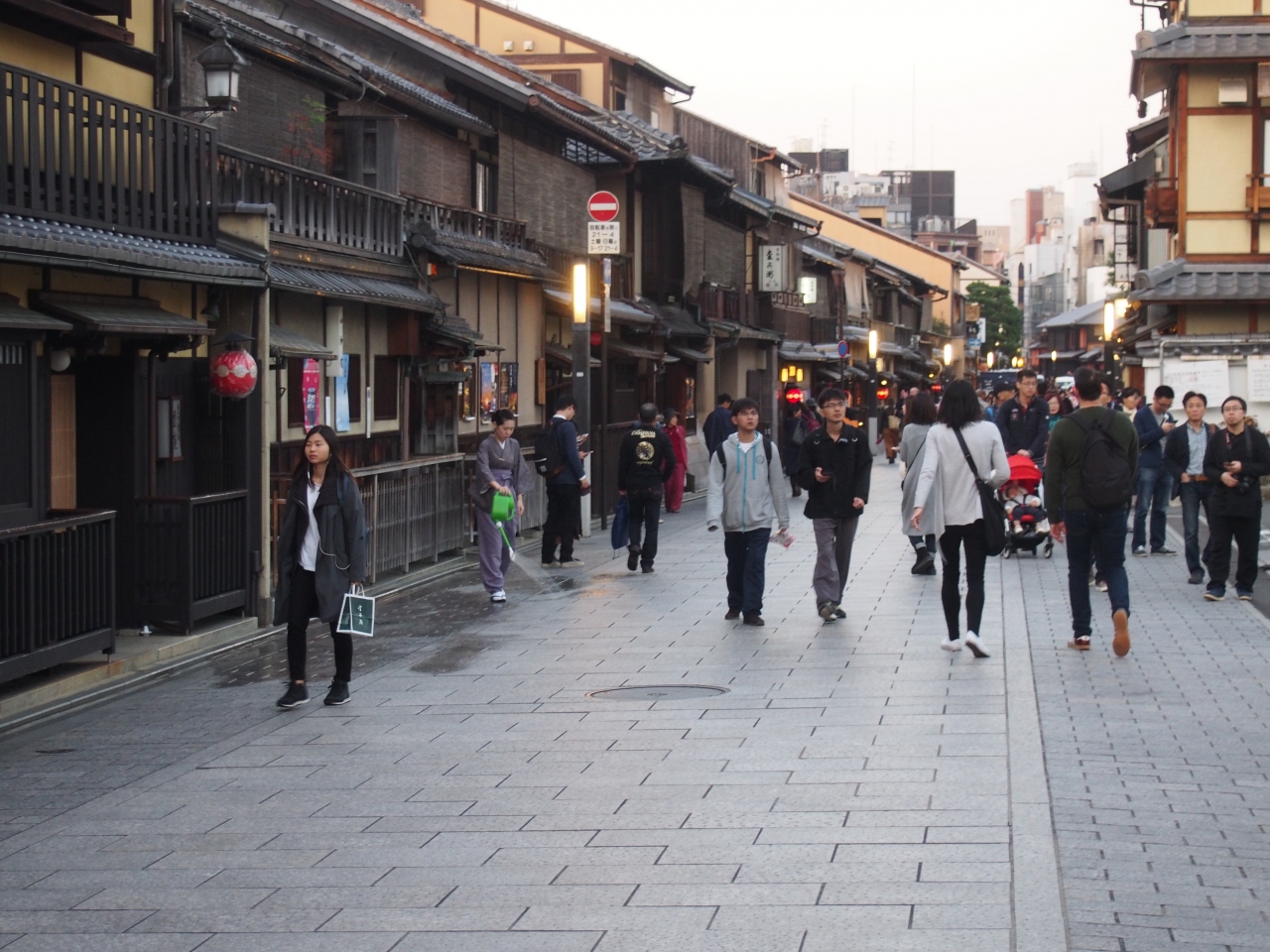 清水寺、建仁寺などの観光を終えて四条大橋へと向かう途中に花見小路を通りました。日暮れ前でしたが、観光客も多く歩いており、とてもにぎやかでした。花見小路は電柱もなく、和風の木造の家並みも整備され、きれいな石畳の道とこれは京都の観光地という感じです。もう少し夜になると夜の祇園にと変わっていくと思われます。