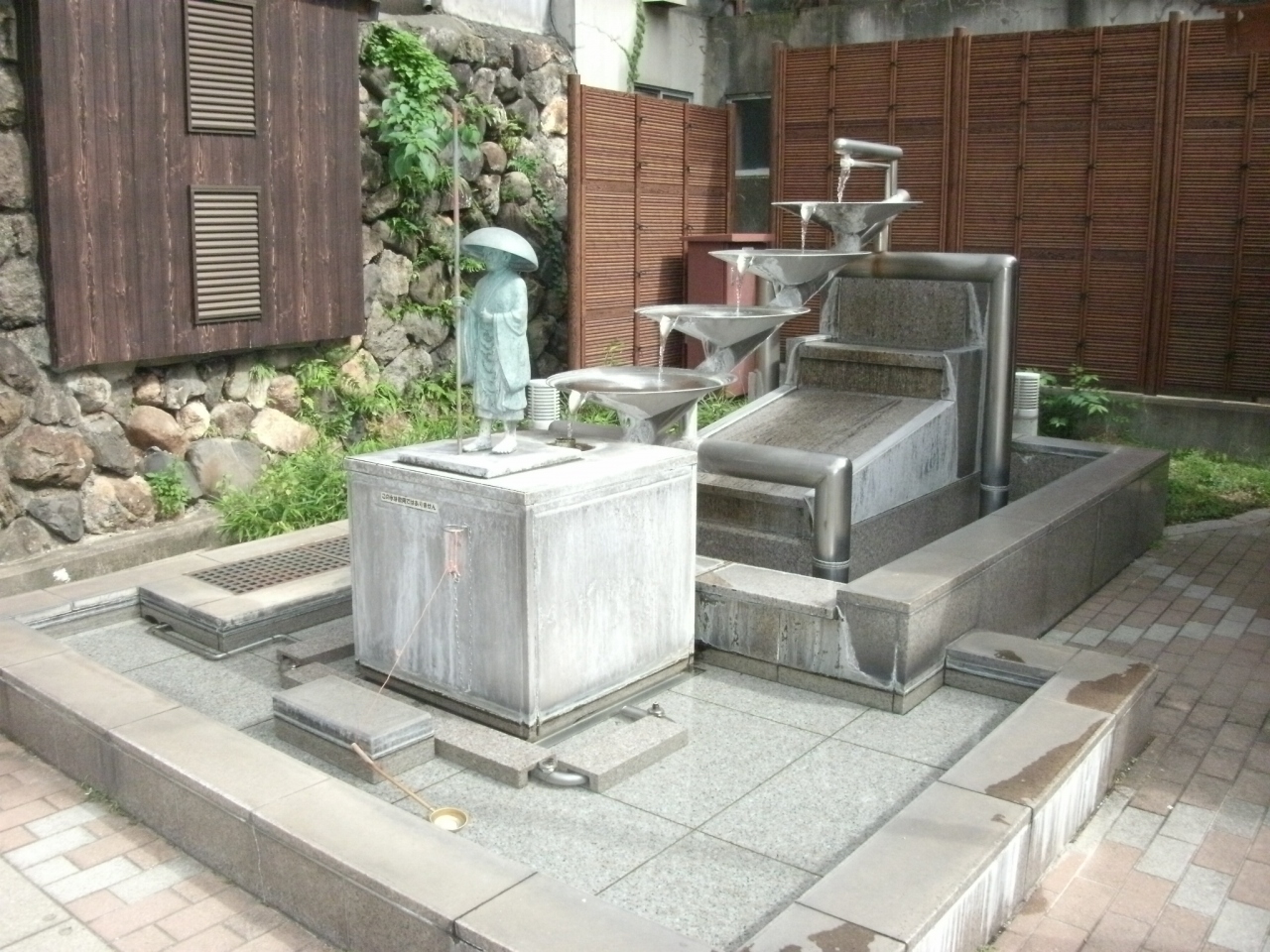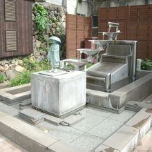 “荒湯”からほど近い“ポケットパーク”に「湯時計」があります。湯村温泉を見つけたとされる慈覚大師のブロンズ像の上から4段になったステンレスのカップを伝って落ちてきた湯の量で時間を計るもので、しばらく見ていると像が持つ棒が20分ごとに上下するようになっていました。