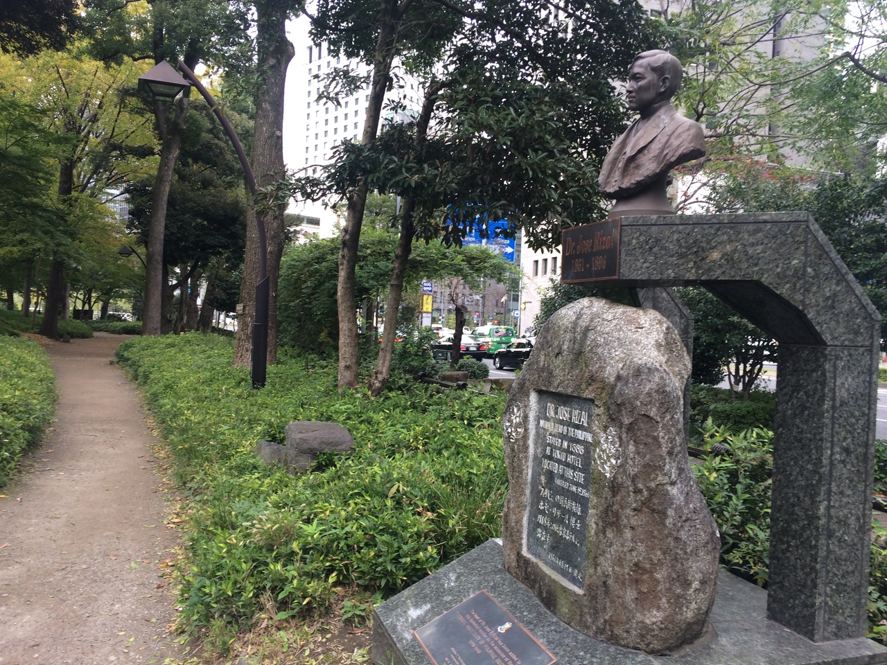 交番横の有楽門を入り直ぐ左手の小道に入ると散歩道のようになっていて左側に銅像があります。英語で氏名が書かれていて、下の石に英語と日本語で一言簡単な説明文がありました。髪型は七三分けしており、なかなかの男前でした。