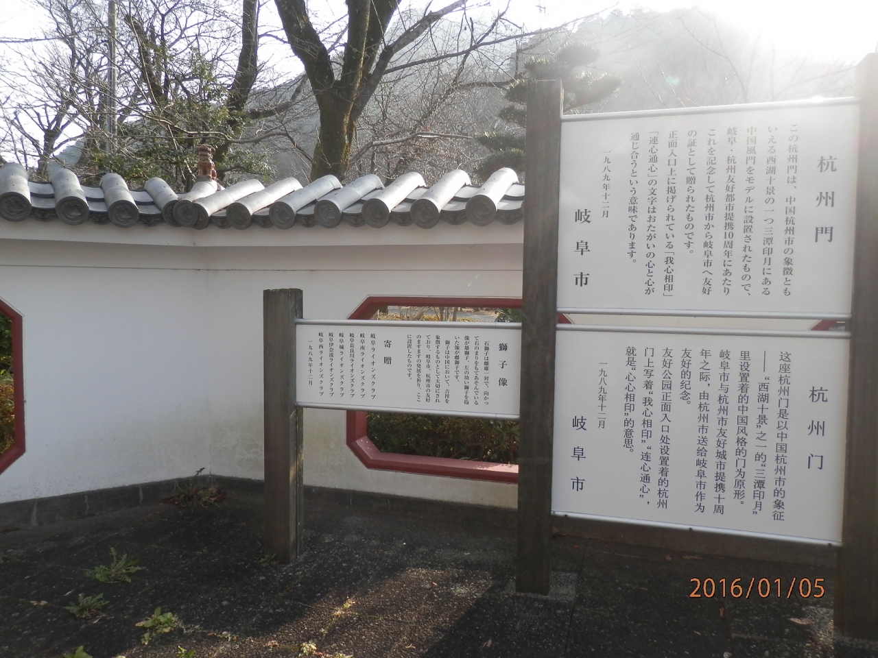 宿泊した岐阜グランドホテルから歩き出し長良橋を渡り岐阜公園に向かうと中国風の門が見えたから来てみたら、日中友好…でした。たいへん静か。川の流れる音がするのみ。休み処としていい雰囲気。朝からトイレ掃除もしてくれていました。