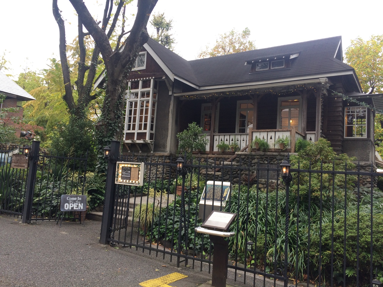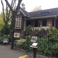国内初の洋式公園の管理事務所で、今は1階に倉庫、物入れ、厨房、トイレになっていて2階入り展示室、ホール日本庭園なっていますお洒落な外観になっています。隣接したお洒落なレストランには説明文看板が2つあります。