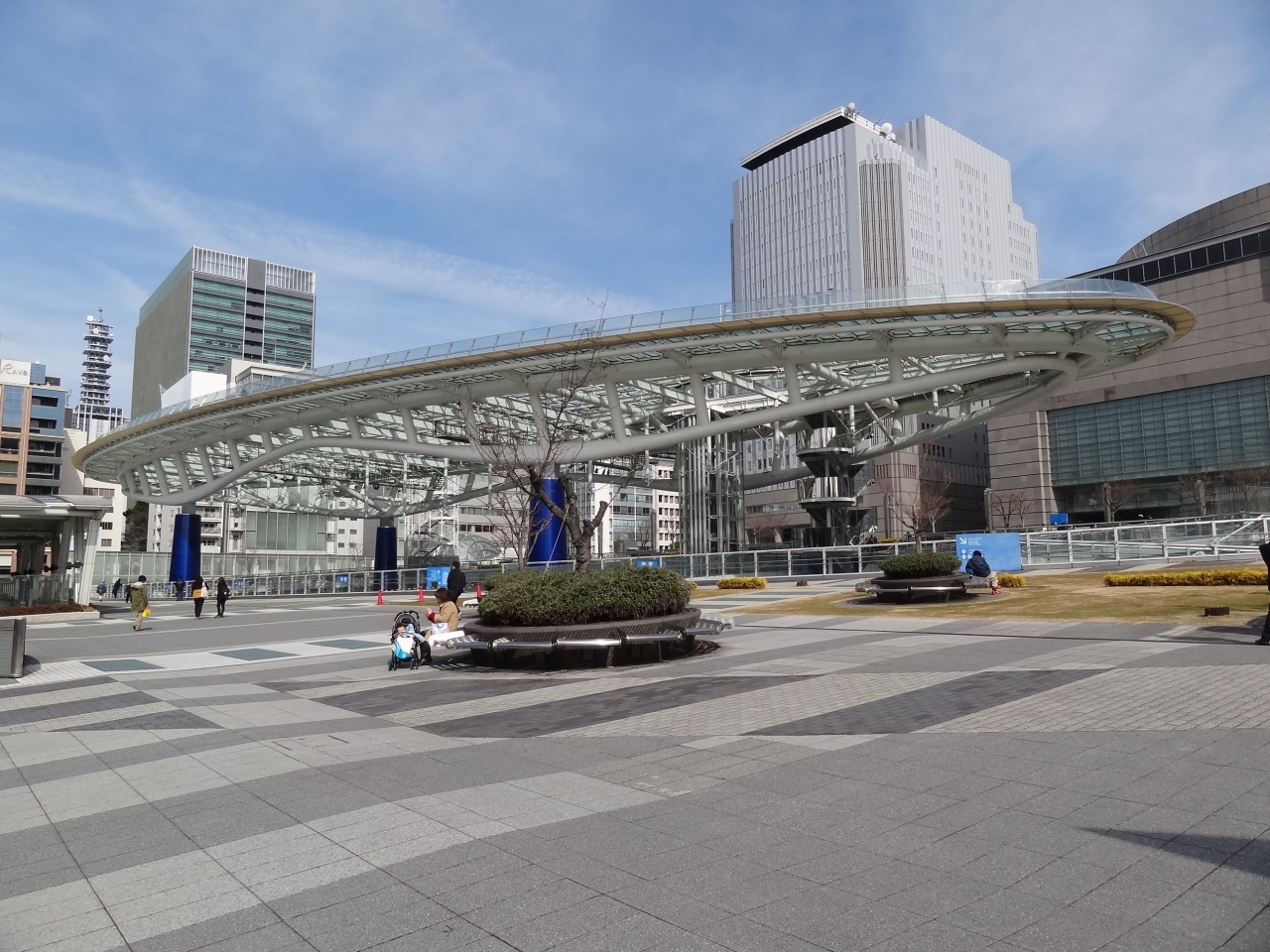 ガラス張りの池のようなものが広場の真ん中にあり。