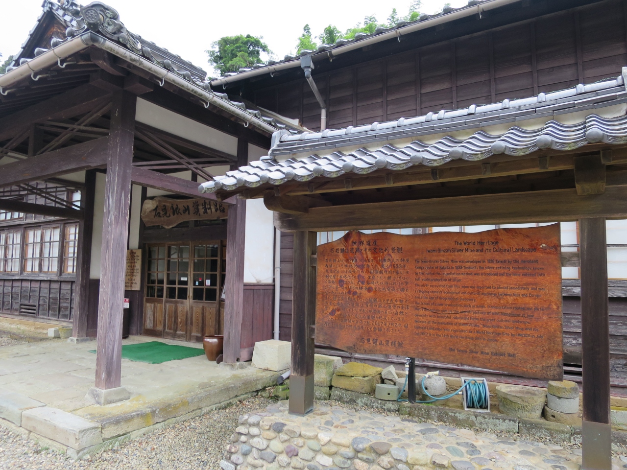 石見銀山 大森地区の古い町並みの一番南側にある石見銀山の資料館です。旧代官所の跡にあり、資料館の建物自体は明治35年に建てられた旧邇摩郡役所ですが、見た目は木造の古い小学校の校舎の様です。代官所の遺構としては長屋門が通りに面してあり、仮牢等が見られます。