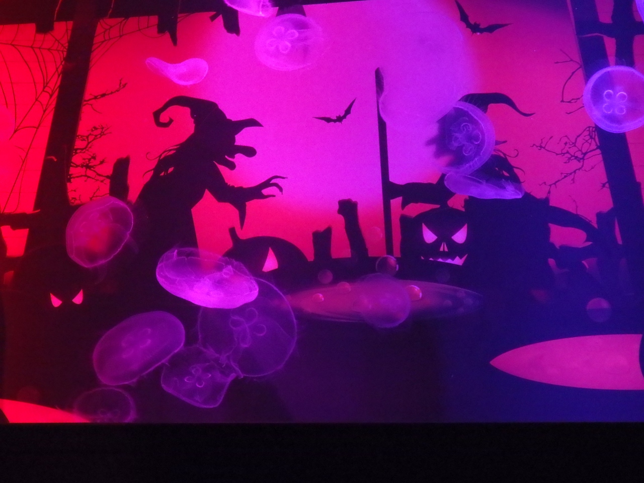 「クラゲとハロウィーン」という企画展示をしていて、クラゲ万華鏡トンネルがハロウィーン一色に塗り替えられていました。季節に合わせて、展示に工夫を加えるのがここの水族館の魅力のひとつだと思います。季節ごとに立ち寄ってしまいます。