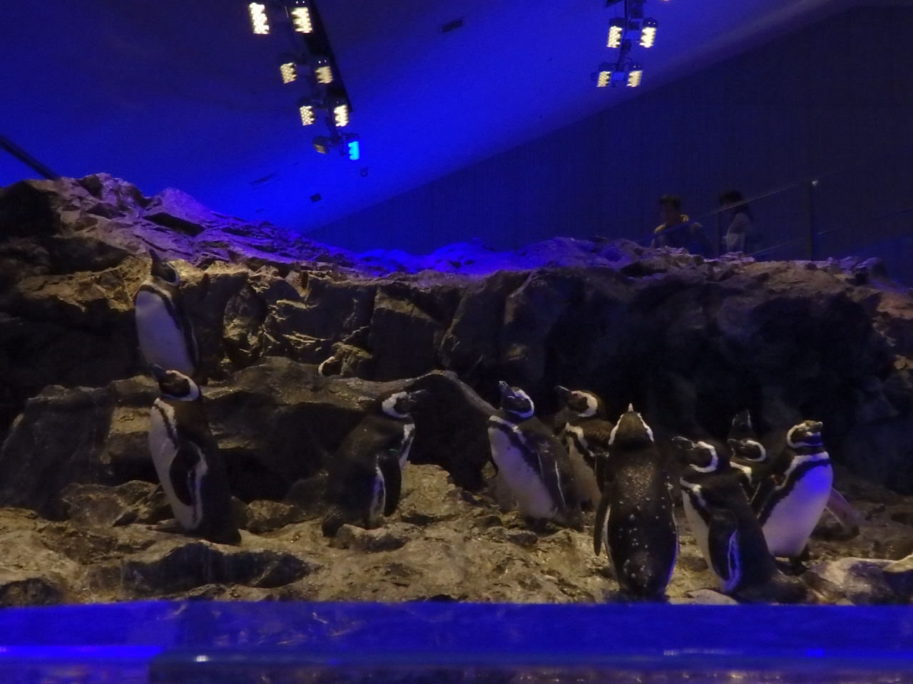 閉館時間が近かったので、ペンギンたちはもう眠むたいようすで、プールで泳いでいるのは2~3羽でした。岩の上でこっくりこっくりしているペンギンもいて