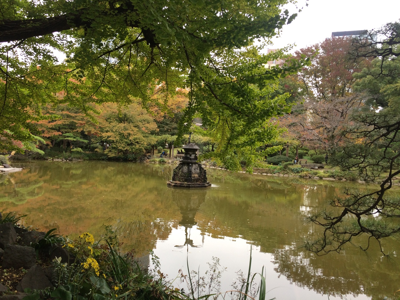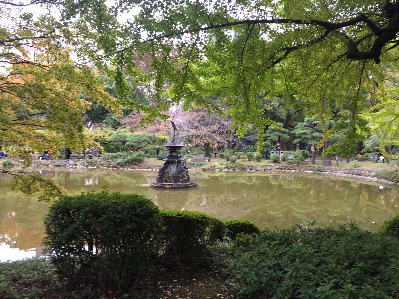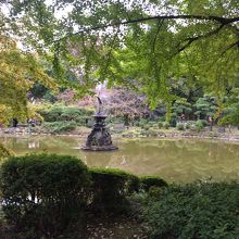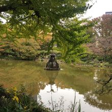 雲形池の池の真ん中あたりにある噴水で、嘴あたりから水を出しています。人があまりいなく静かでしたが、嘴からに落ちる音がなんとも言えず良かったです。鶴は台の上にのっているような感じで廻りの木々が少し紅葉していたのでより良い景観でした。