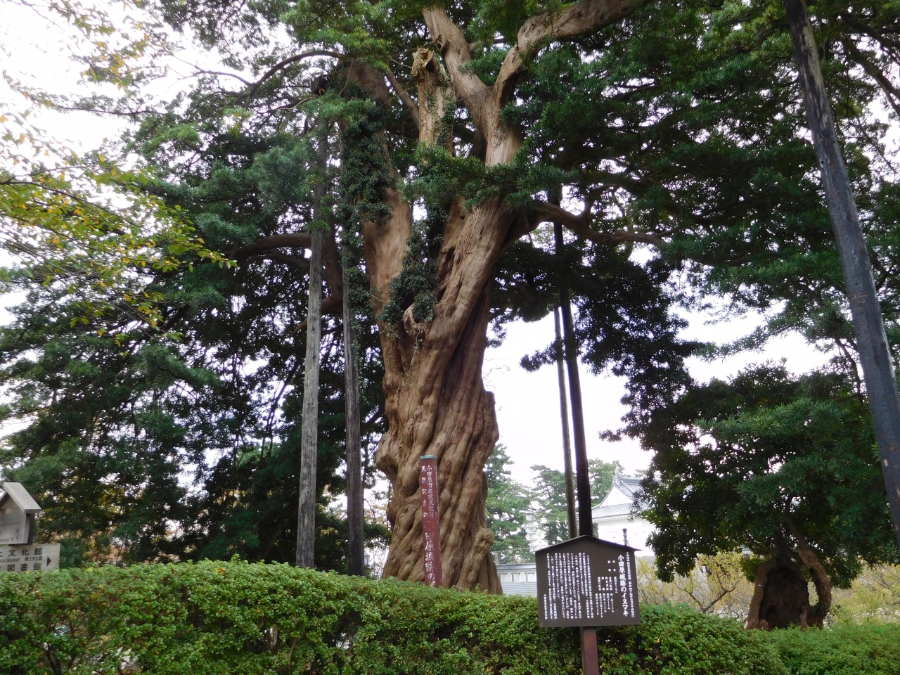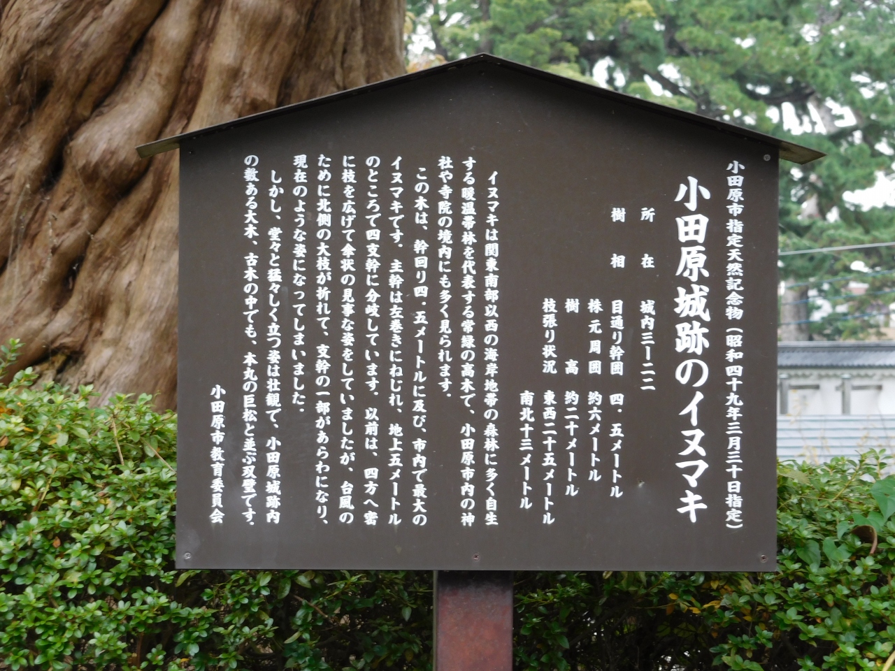 小田原城址公園内の、歴史見聞館と常盤木門の間位の場所にある、大きな「イヌマキ」です。幹が上に向かってねじれるような形になっているのが特徴的で、青々とした葉が広がるように茂っていて、すごく生命力溢れる木で、パワーを感じました。小田原市指定天然記念物です。