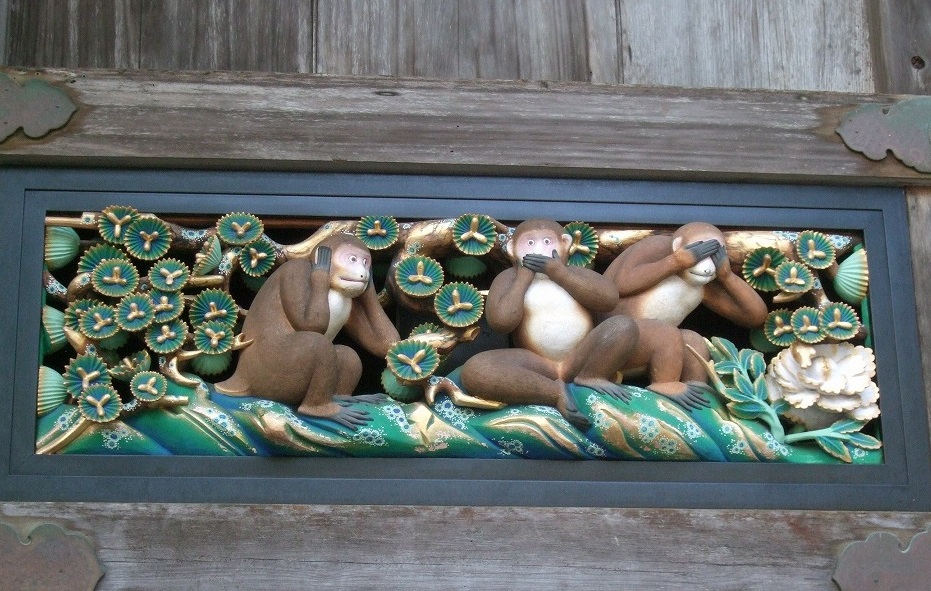 神厩舎で有名な彫刻が三猿で、「見ざる、言わざる、聞かざる」の三体が見事です。三猿を見て、いつも我が身の行動を振り返ってしまいます。