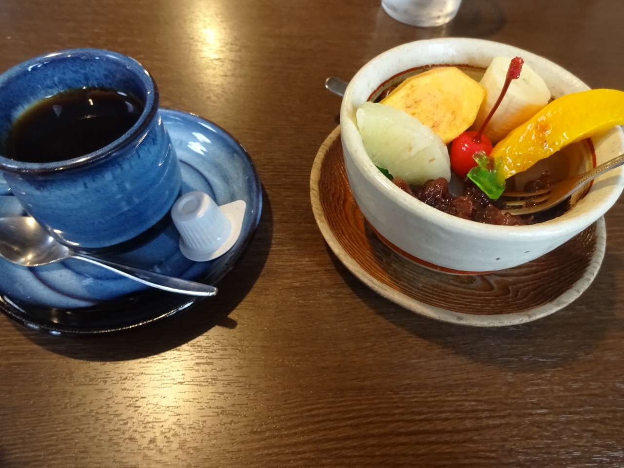 私はコーヒーとあんみつ。一緒に頼むとセット割引になって居ました。