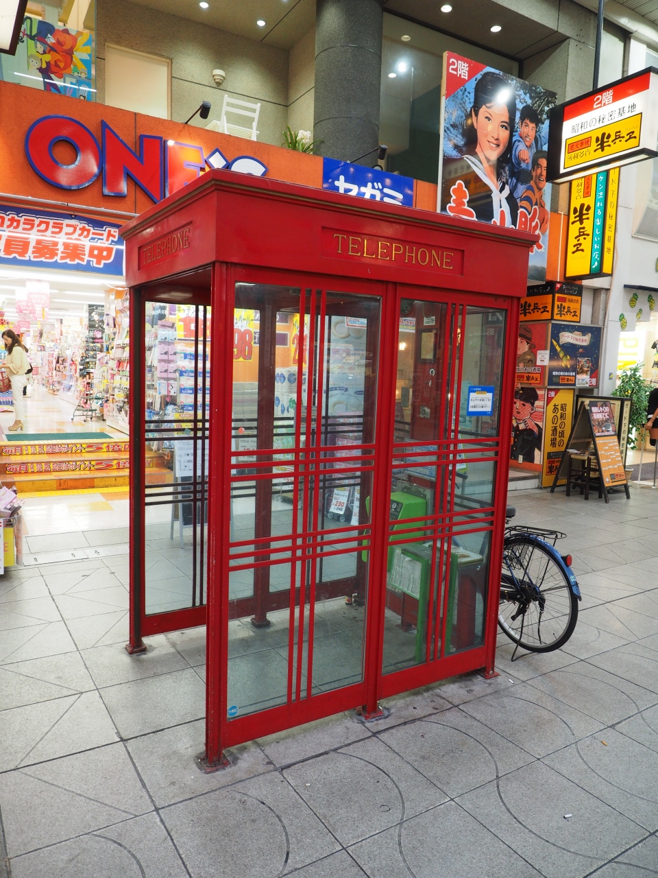 飲食店や商店がずらっと並び、足元に松山市内にある名所の版画絵があったり、道の真ん中に大きな電話ボックスがあります。よくある地方のシャッター街とは違く、ここは活気がありました。