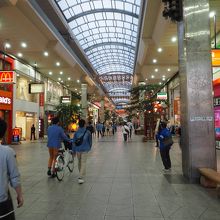 とっても幅の広いアーケード街です。屋根があるので、天候が悪くても楽しむことができます。歩行者専用になっていて、自転車の人は押して歩いていました。また、ところどころにベンチが設置されています。