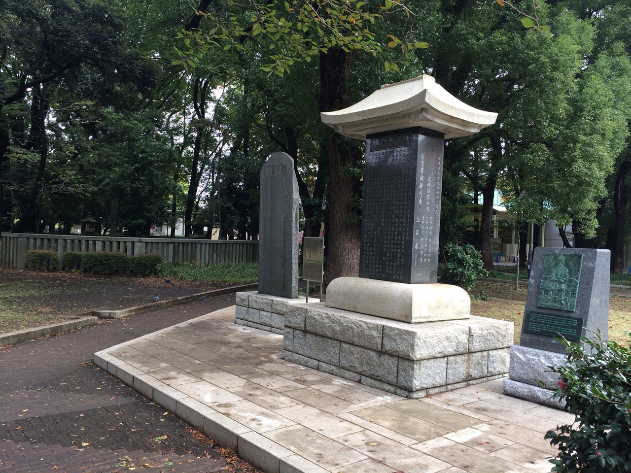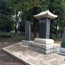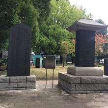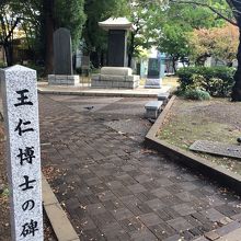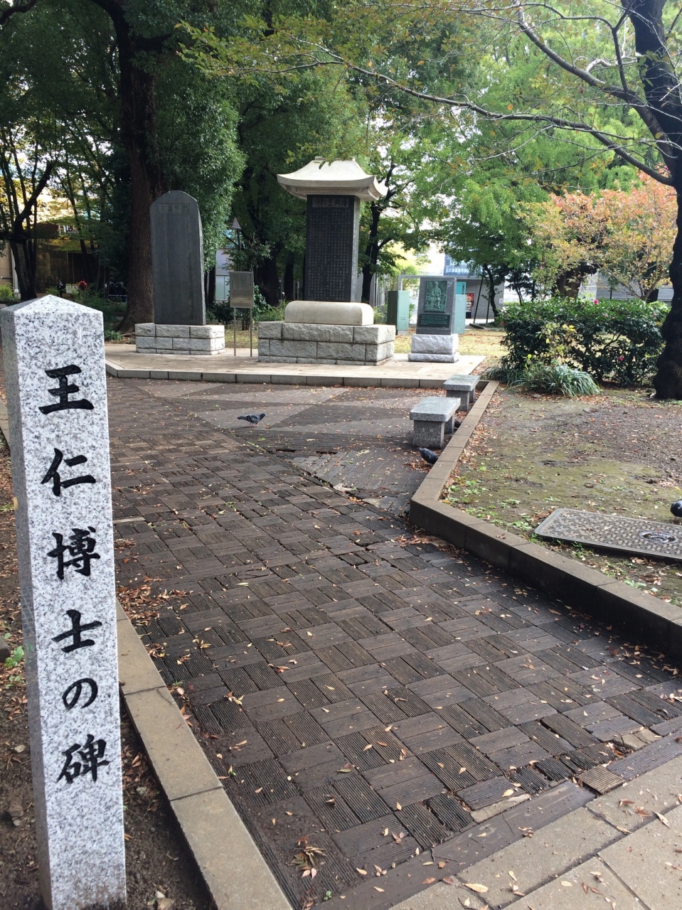 古墳時代に論語や千字文を伝えた学者で案内板には日本語の他、英語、韓国語が併記されていたので外国人が立ち寄って見ていました。石に3つの碑が建っていて一つは、博士の座ったすがたが描かれいかにも学者という感じでした。