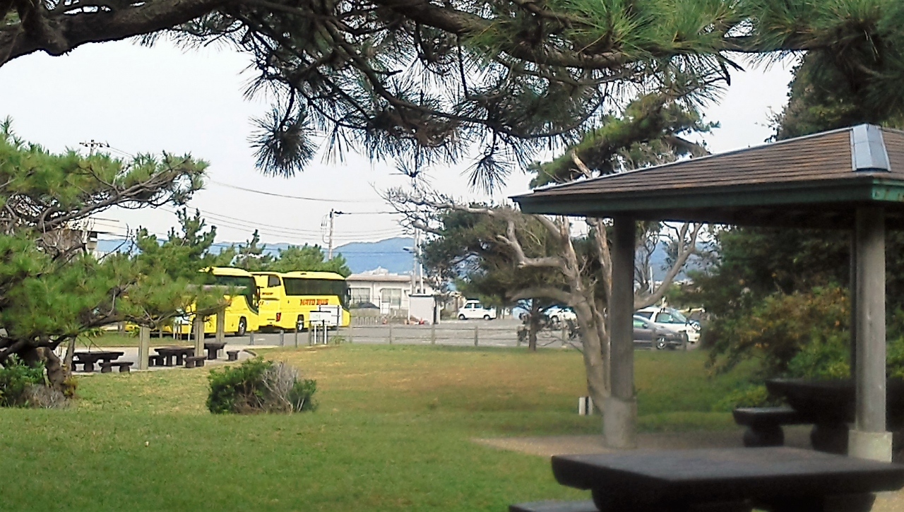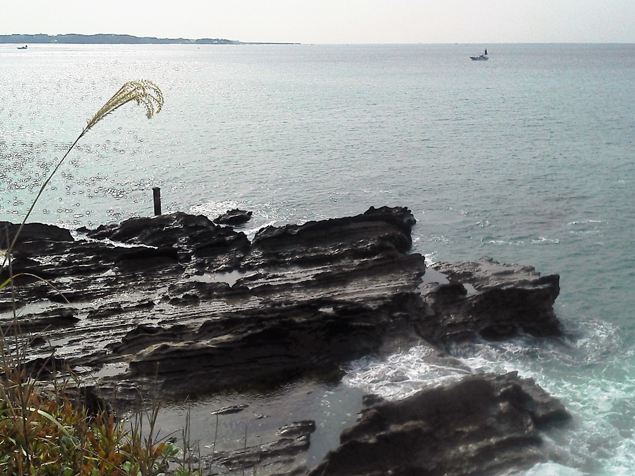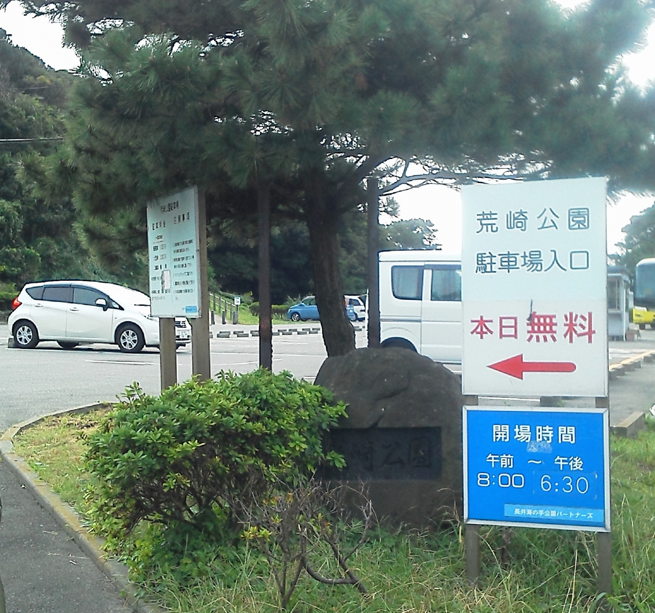`えっ、はとバス それも2台?`と思わず見直しました。確かに、三浦半島にしては珍しい[頁岩と凝灰岩が層状の海蝕台の荒崎海岸]ですが! バスの気のよい運転手さんに聞いたら`貸切;中学校で三浦半島を一周`でした。確かに「荒崎公園」は駐車場/広場/新設トイレで、眺望;切り立った断崖/(天気次第ですが)富士山も。この風景を一望するのは2回目ですが1回目では分からない景色も(^o^)
