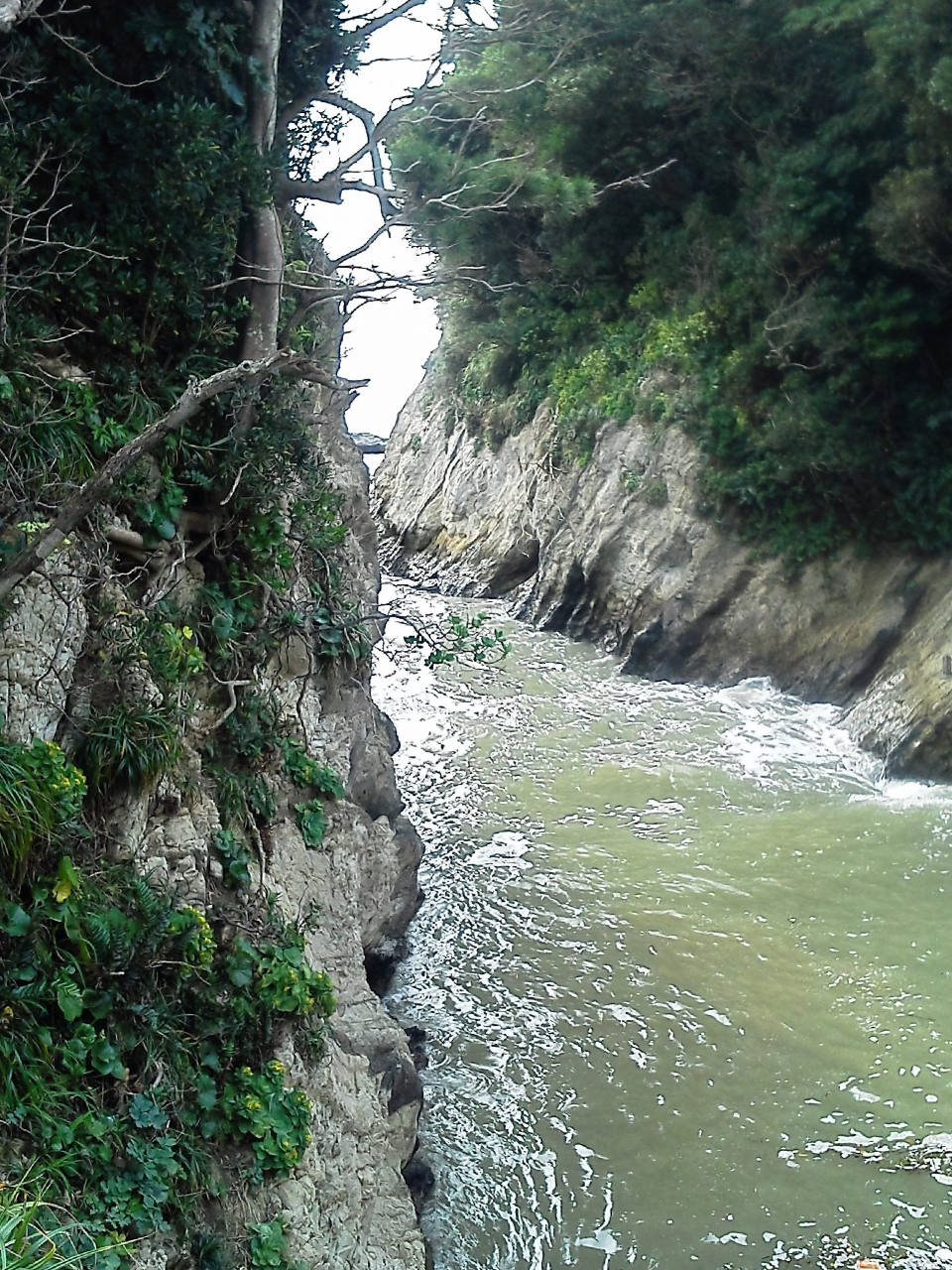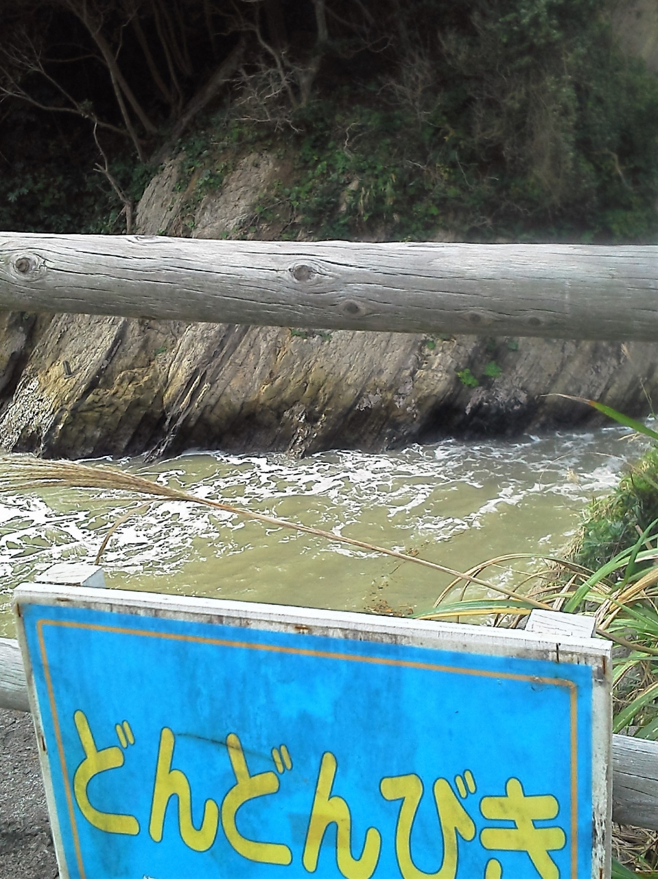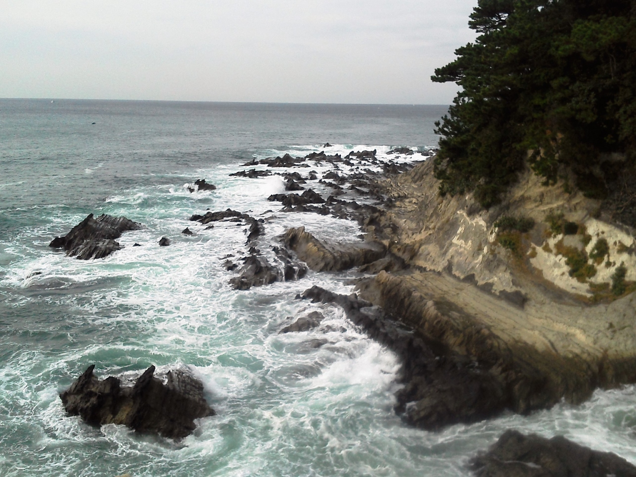 `えっ、はとバス それも2台?`と思わず見直しました。確かに、三浦半島にしては珍しい[頁岩と凝灰岩が層状の海蝕台の荒崎海岸]ですが! バスの気のよい運転手さんに聞いたら`貸切;中学校で三浦半島を一周`でした。確かに「荒崎公園」は駐車場/広場/新設トイレで、眺望;切り立った断崖/(天気次第ですが)富士山も。この風景を一望するのは2回目ですが1回目では分からない景色も(^o^)