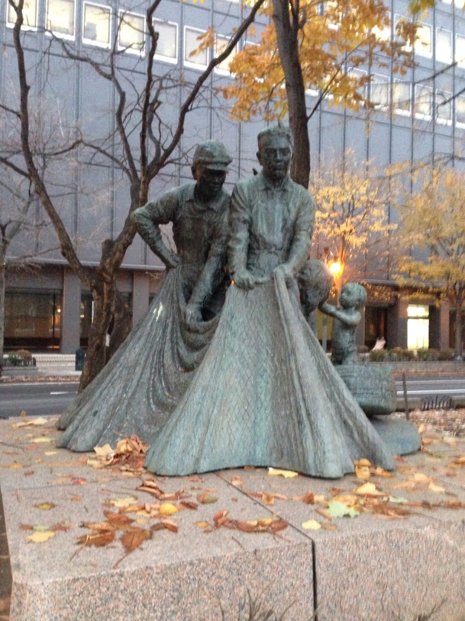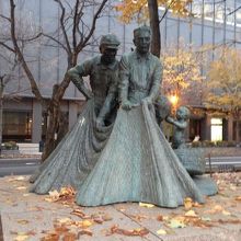 大通公園に数ある像の一つ、その名のとおり網を引いている漁師さんの像です。北海道100年と北海道漁協婦人部連絡協議会なるものの10周年を記念して建てられたもの。