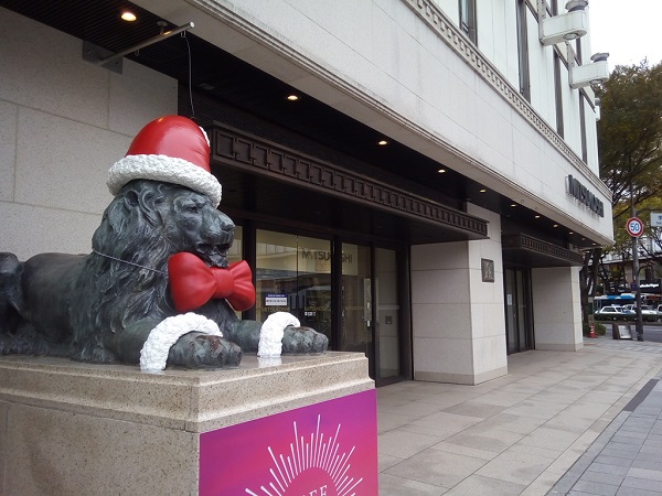 三越のシンボル、ライオン像がクリスマスの飾りつけをされていて可愛かったです。