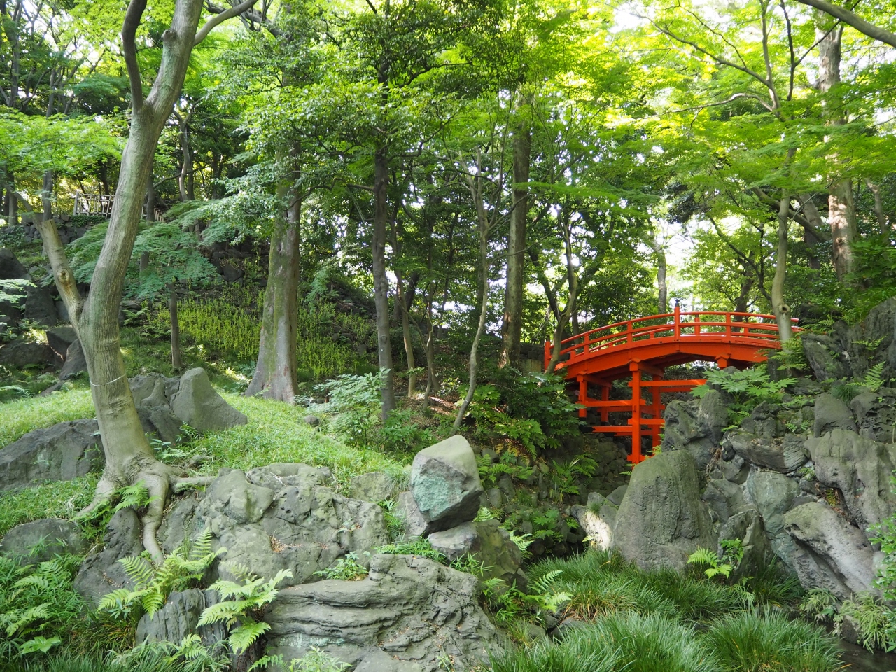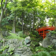 緑に映える綺麗な朱色の橋です。