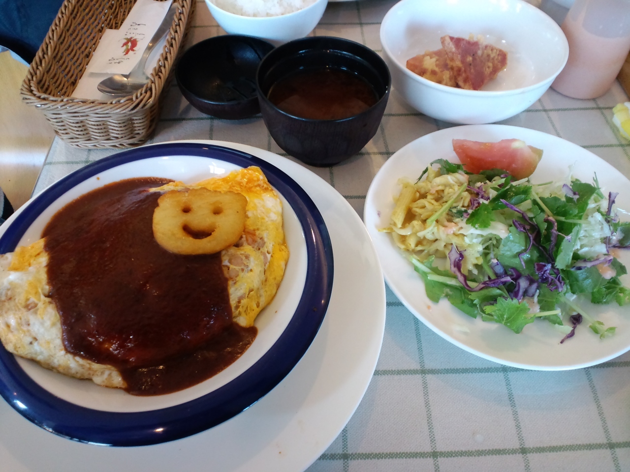 オムライスに、サラダ、味噌汁、ドリンクも付いているのでお値打ちです。