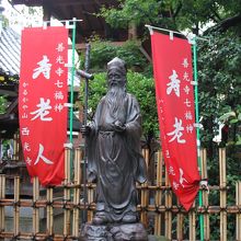 境内に立派な像があります、右手に巻物を巻き付けた杖を、左手に不老長寿の桃を持っています。
