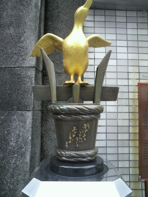 鏡面加工の金属台座の上の桶に、アヒルが乗っている像が立っています。