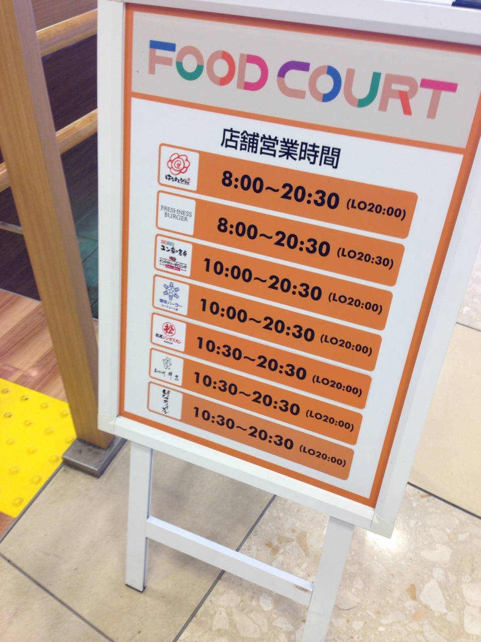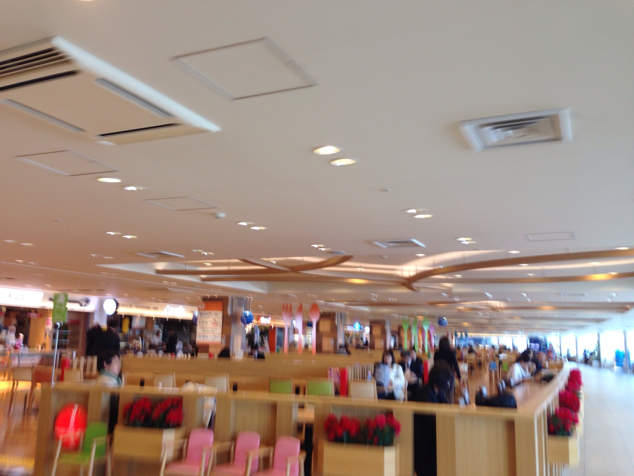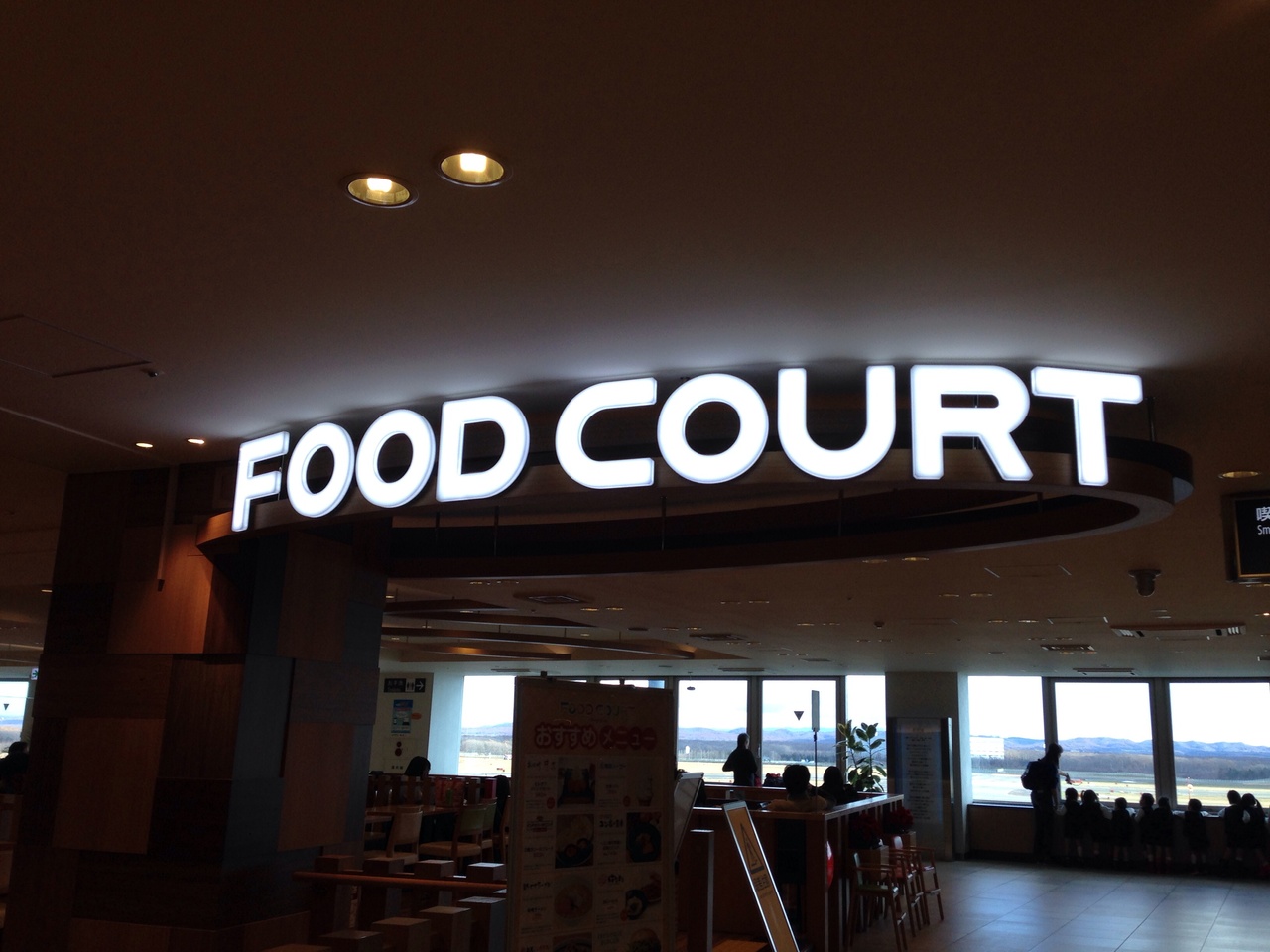 ガラス張りの窓と広いスペースの開放感溢れるフードコートです?窓部分はフリースペースで通路となっていて少し離れて席があるので やや引き気味に滑走路が見えるといった感じです。