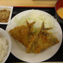 JR平塚駅北口の紅谷町アーケード街にあります。1Fがペットショップだったかな。2Fへ階段を上ります。カウンターのみのお店です。食券を買って注文です。アジフライ定食を注文。すると、すぐ生卵と納豆パックがでてきました。まもなく揚げたてアツアツのアジフライ!キャベツもたっぷり。豚汁まで付いてきました。漬物やネギも食べ放題。これで530円は、お得です!いろいろ食べてみたくなりました。夕方は15:00からです。