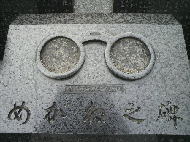 橋を渡ると、すぐ右側に、めがねを形どった円形部を付けた碑があります。めがねの碑です。