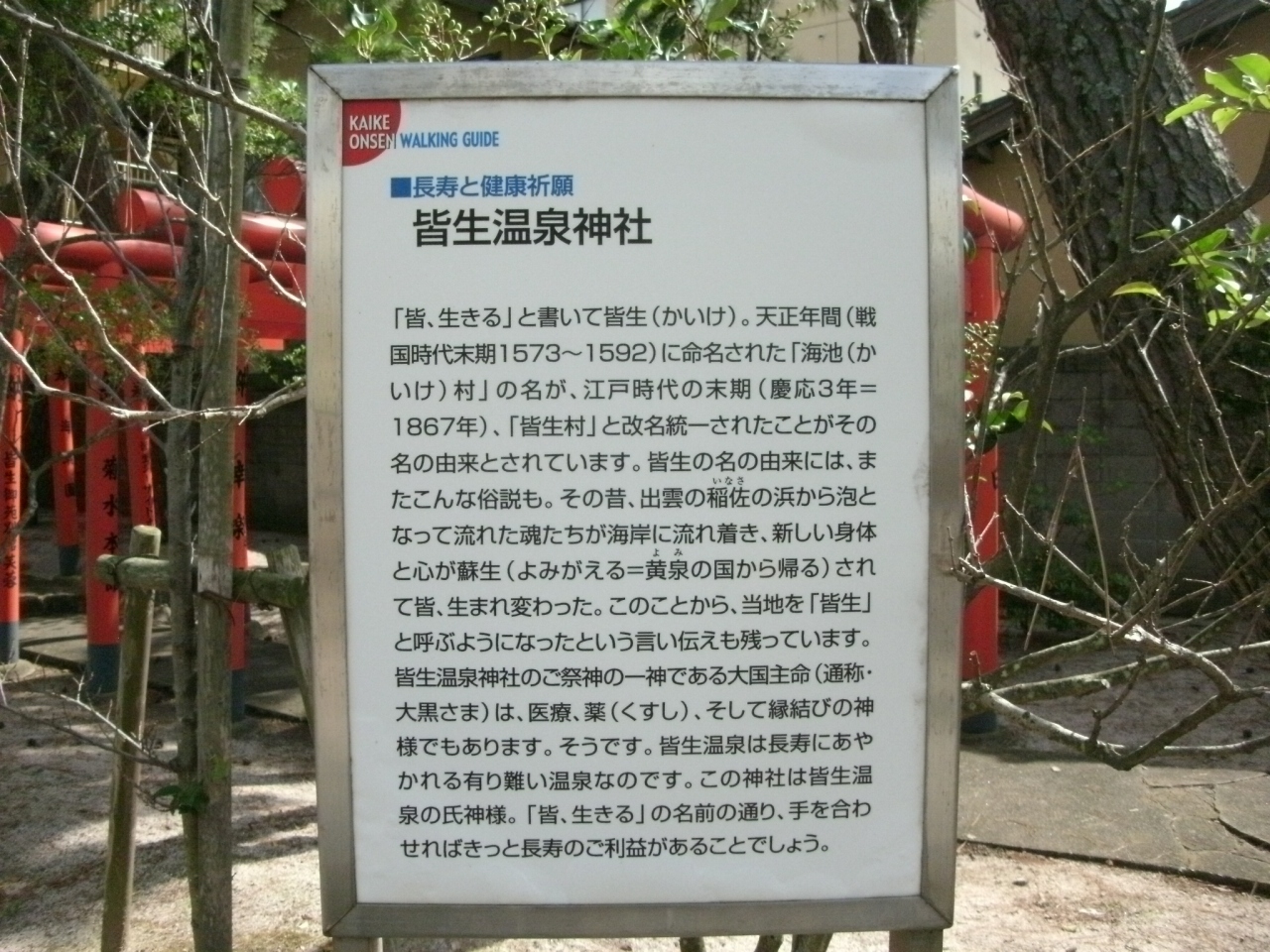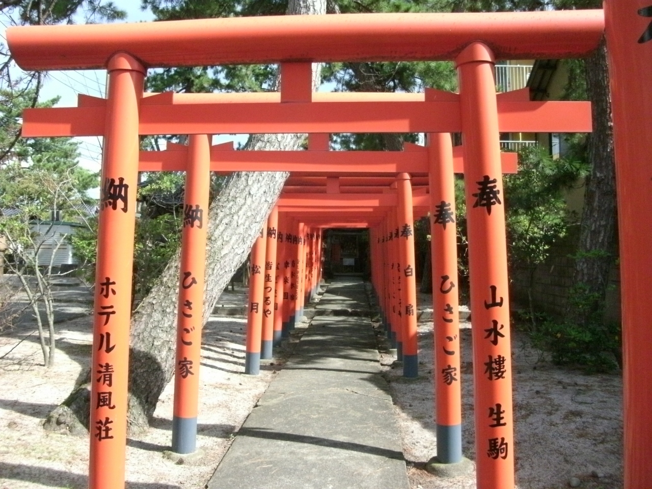 温泉街の東の端に鎮座されています。現地にあった説明板(添付写真を参照ください)によると、皆生温泉の氏神様で、長寿のご利益があるそうです。説明板には創建などの由緒がないのでそれほど歴史はないと思われました。とても小さな神社で、社殿など特別観るべきものはありませんでした。
