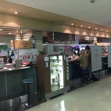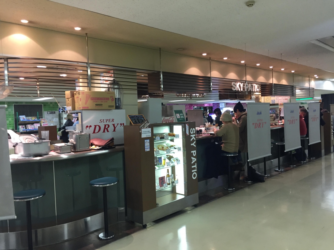 保安検査場内にある軽食のお店です。カレーやサンドイッチの他、たこ焼きもありました。そのたこ焼き、一般的なソースを掛けたものと、もうひとつだしで食べるたこ焼きもありました。さすがは大阪です。たこ焼きは6個で400円。やや大ぶりなので見た目よりも食べ応えがありました。ビールと一緒に。最後の大阪を満喫。営業時間は朝6時半から20時までです。