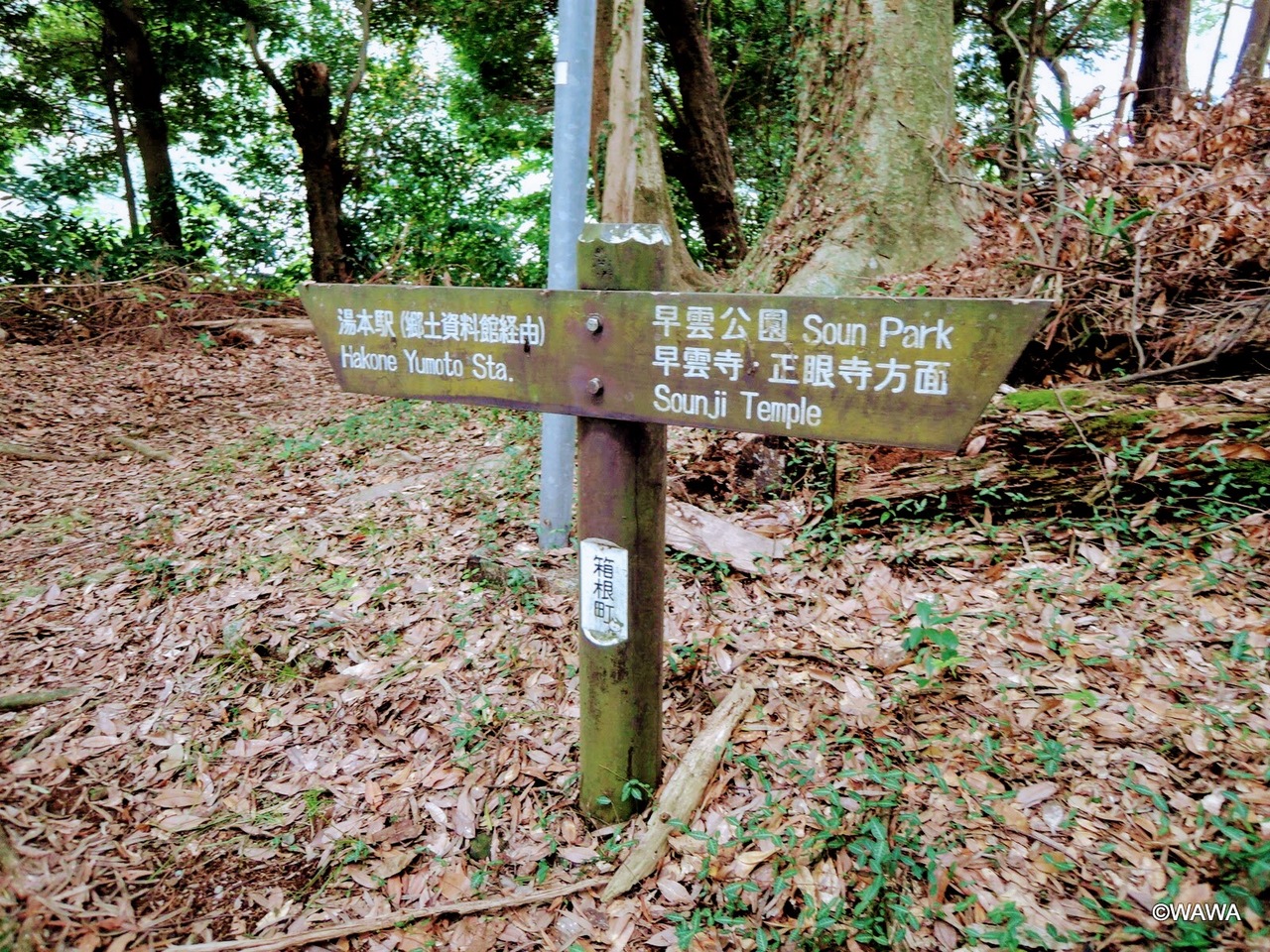 箱根町の旧東海道沿いにある早雲寺から、徒歩で山道を通って最短距離で郷土資料館へ着きました。明神神社の杜の中に案内板はあるのですが、道らしい道は見当たりませんでした。枯葉がつもる斜面を下ると町役場裏の階段に出ました。階段を下ると町役場があり、その横が箱根町郷土資料館でした。