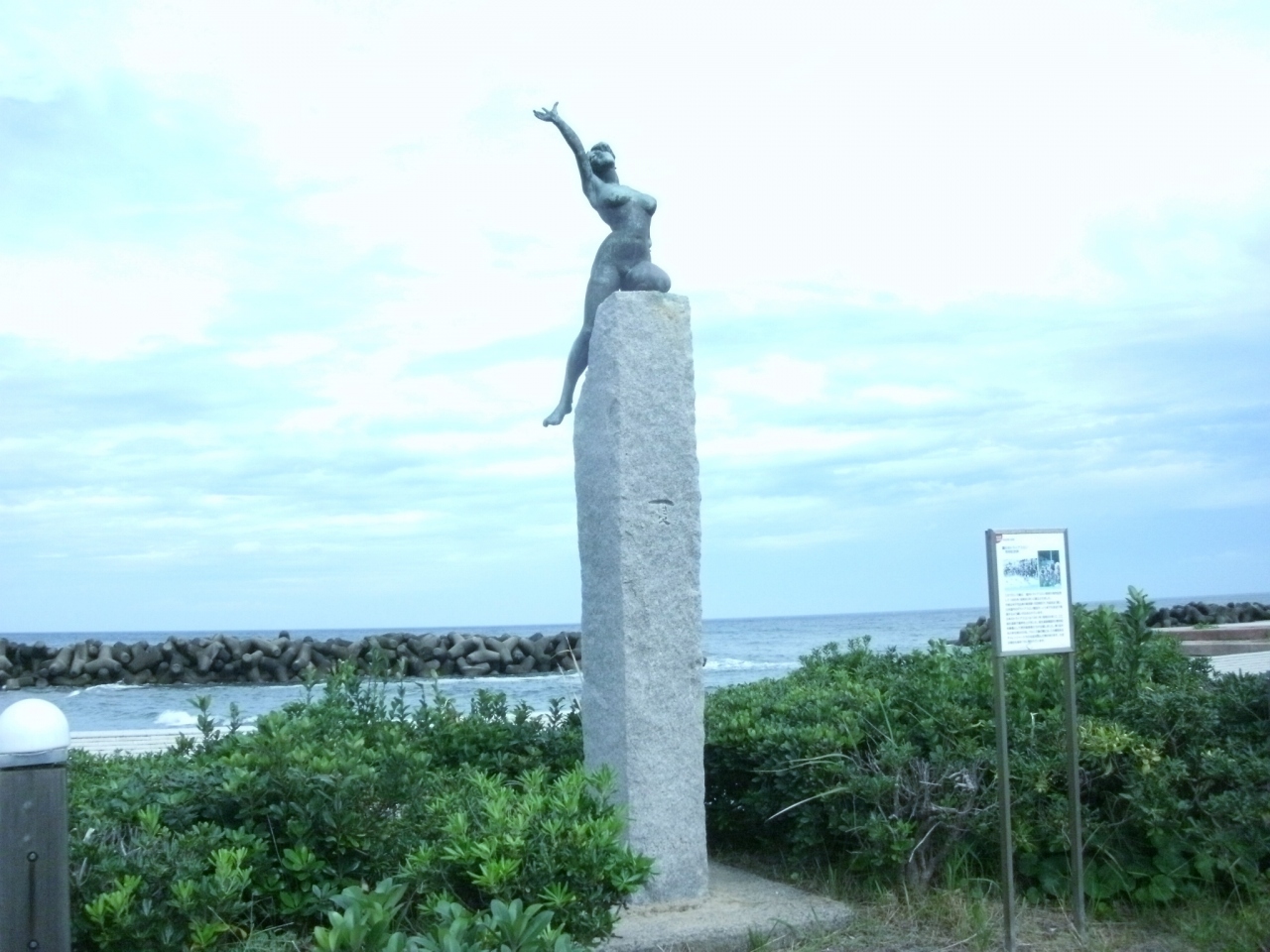 観光センターから県道300号線、「トライアスロン通り」を東に進み、最初の交差点を左手に曲がって(三条通り)海岸方面に歩いて行くと突き当りに、日本トライアスロンの発祥を記念して作られた記念碑がありました。
